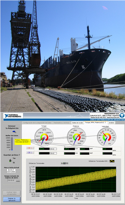 Aplicado en las industrias eléctrica y naval, TRACTorque es un sistema de adquisición y análisis de datos que provee una solución completa a la obtención del torque y velocidad instantánea que se producen en hasta dos ejes de transmisión de manera simultánea y su posterior análisis. El torque es obtenido a través de un sensor tipo puente de galgas extensiométricas (strain gages) y un transmisor inalámbrico, ambos solidarios al eje en cuestión en tanto que la velocidad es obtenida a través de sensores de proximidad colocados en ruedas dentadas pertenecientes al impulsor de los ejes. Adicionalmente, también es posible la adquisición de una señal analógica adicional, como podría ser la fuerza proveniente de una celda de carga en los ensayos de tiro de bolardo de una embarcación. La aplicación está formada por dos partes principales: