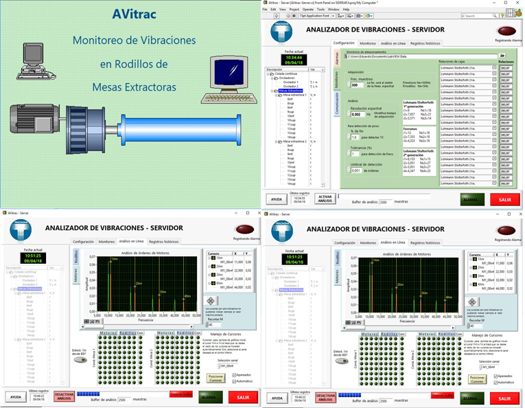 El analizador de vibraciones AViTRAC se desarrolló bajo pedido para monitorear las vibraciones en rodillos de mesas extractoras de un tren de colada continua en una importante compañía siderúrgica. El sistema mide vibraciones en forma indirecta a través de las corrientes de alimentación de los motores que mueven los rodillos a analizar, este principio de medición es también conocido como detección por “firma de corrientes”. Estas corrientes son tomadas por la placa adquisidora instalada en una PC industrial, la cual ejecuta el programa servidor AViTRAC Server para el análisis de vibraciones. Con AVitrac-Server se miden las distintas corrientes consumidas por los motores de cada línea, las cuales se analizan en frecuencia y se comparan con ciertos valores máximos configurados para alarmas, para poder realizar registros automáticos de las situaciones críticas.